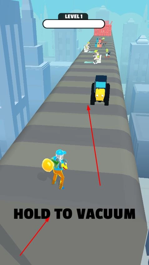 1、在关卡1中,长按屏幕“HOLD TO VACUUM”即可启动吸附功能,吸取沿途的物品,比如灯、人和方块等。