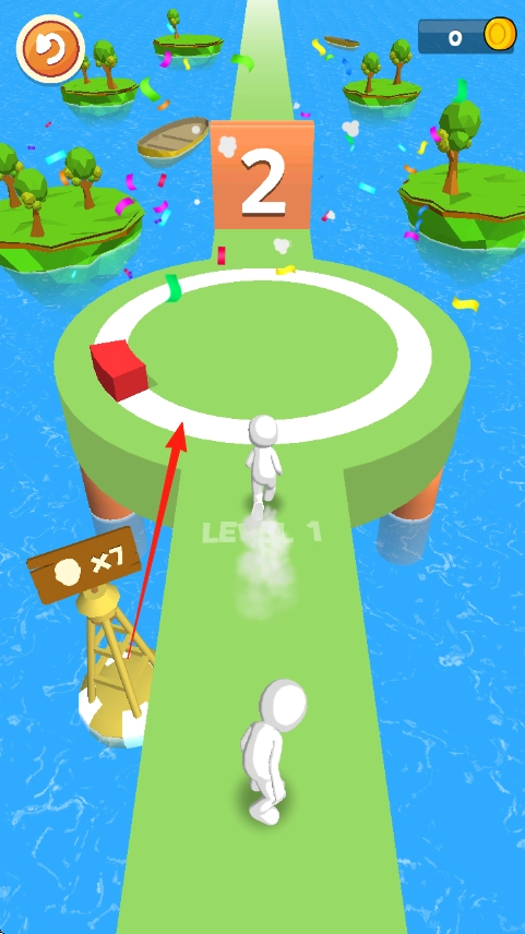1、进入关卡后,操控白色小人,按照箭头指示,前往环形跑道的起点,同时注意观察场景中的道具标识,提前为后续收集道具做好准备。