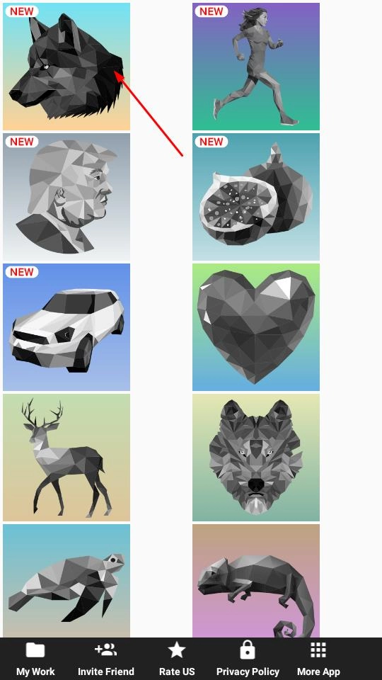 1、进入界面后,选择带有NEW标识的图案(例如狼头等),点击该图案就能开启对应的多边形拼图挑战,从而启动创意拼接流程。