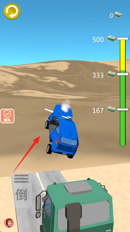 3、按箭头,把车开离公路进沙漠,这时要留意绿色卡车,灵活转向躲避,在沙漠路段继续往前,完成这一关挑战,争取高分。