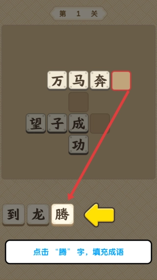 在成语关卡中,点击“腾”字并填入空格,即可完成“万马奔腾”这一成语,顺利通过第1关,同时解锁新的答题内容。
