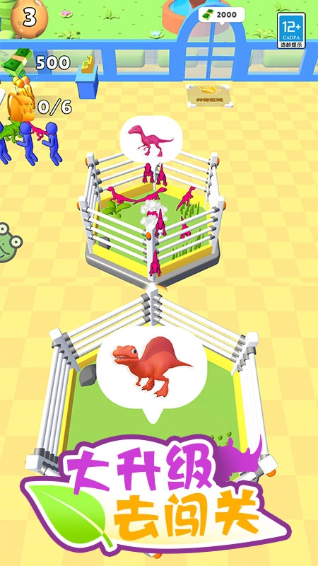 2、攒钱先升接待区,优化顾客体验,再升栖息地,容纳更多恐龙,最后升级捕捉装备,拓展探险捕捉范围。