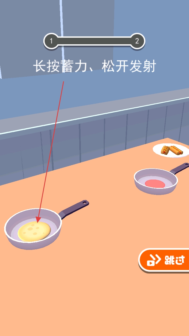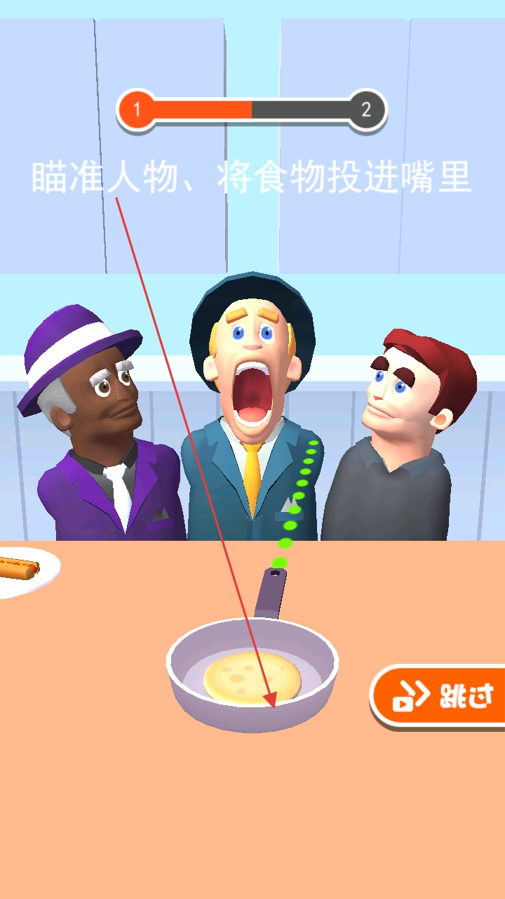 2、长按煎锅蓄力,松开手指发射食物,控制力度与方向,瞄准人物嘴巴。