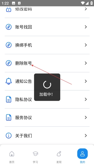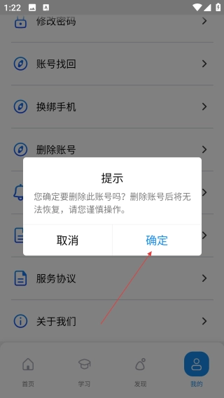 3、在功能选项中,点击【删除账号】,触发账号删除的确认提示弹窗。