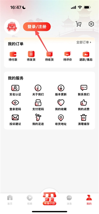 2、在个人页面,点击登录注册按钮,进入登录页面。