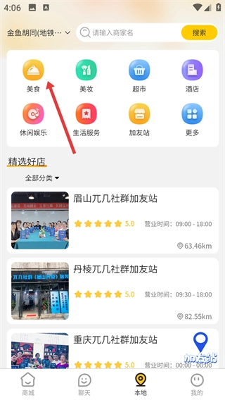 2、在本地页面,点击【美食】分类,可浏览各类美食商家,寻找心仪美味呀。