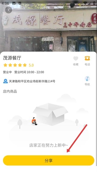4、在茂源餐厅详情页,点击【分享】按钮,可将该餐厅信息分享给好友,一起探寻美食啦。