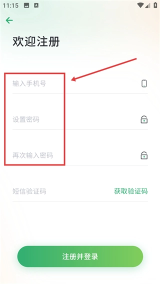 2、在注册页面输入手机号、设置密码并再次输入密码。