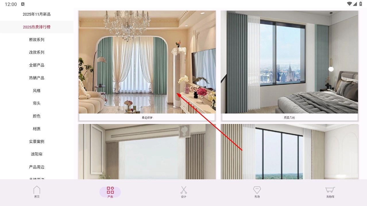 2、在产品分类,选择【2025热卖排行榜】,查看热门窗帘款式。