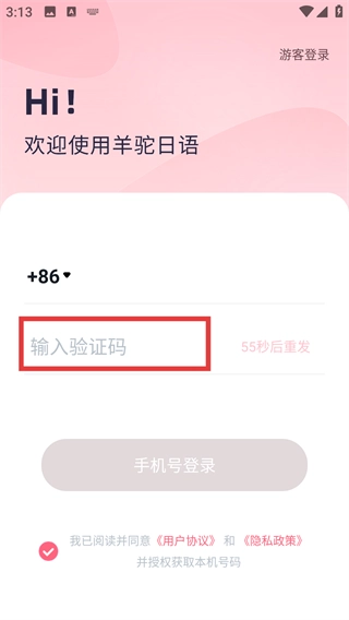 3、接着,我们在框中填写收到的验证码,同时勾选同意【用户协议】和【隐私政策】哦。