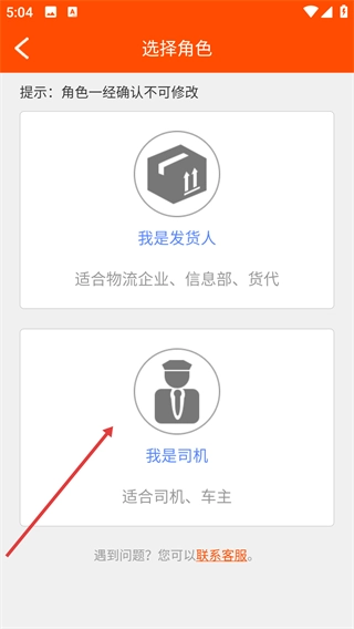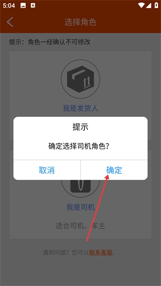 3、进入角色选择页面后,点击【我是司机】选项,调出角色确认的提示弹窗。
