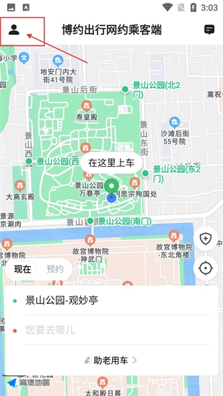 1、在网约车乘客端的主界面,点击左上角的个人标识即可进入登录页面。此应用具备实时叫车和预约用车的功能。