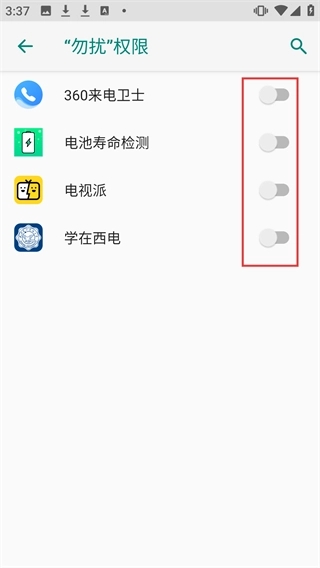 4、在“勿扰”权限页面,可根据需求开启对应应用的“勿扰”权限。