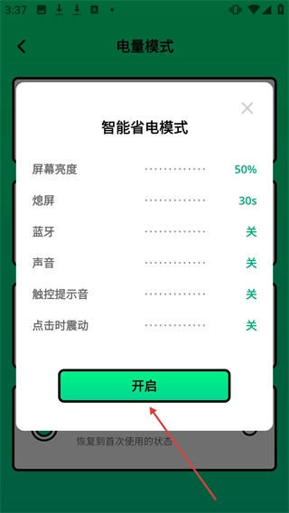 3、在智能省电模式详情页点击【开启】,启用智能省电模式。