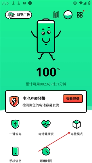 1、在电池管理应用的首页找到并点击【电量模式】选项,即可进入电量模式的选择界面。