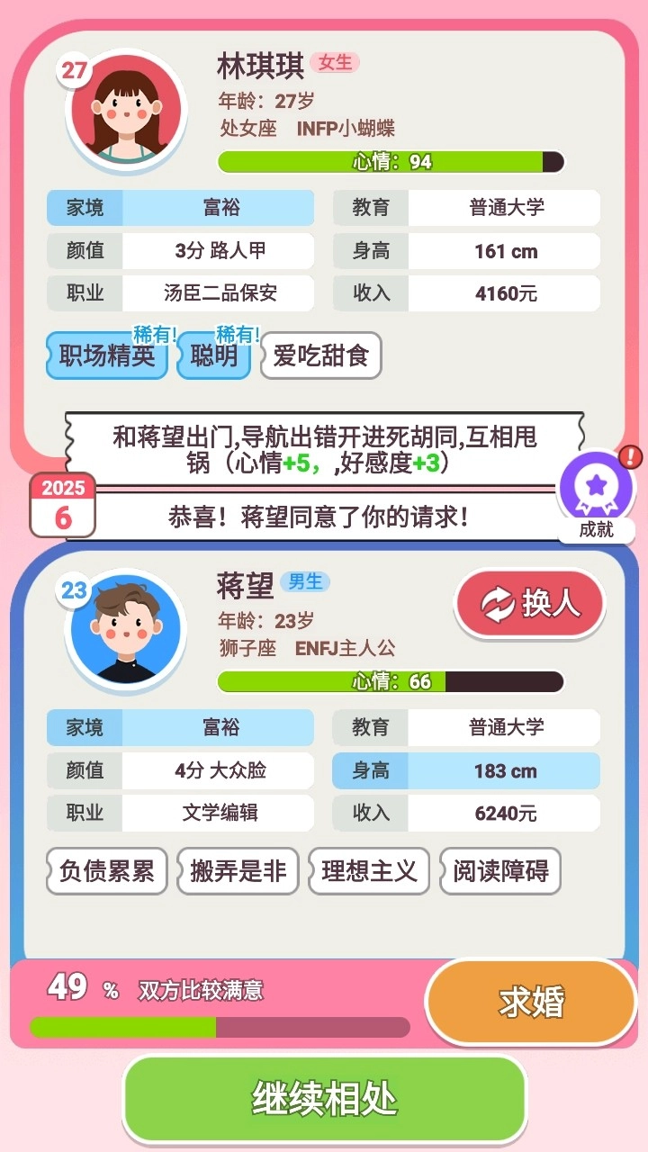 这里有一款相当不错的游戏,玩家可以选择不同的职业与教育方向,通过做出各种决策来塑造角色的人生轨迹。每个选择都会导向不同的结果,进而影响角色的幸福感、财富积累以及社会地位的提升。你还能为角色组建家庭、繁衍后代,见证家族的延续。游戏中设有多种可解锁的任务与挑战,其放置玩法颇具趣味。你可以随时查看对方的满意度,经过一番观察后,选择求婚即可组建家庭。感兴趣的话,不妨来体验一番。