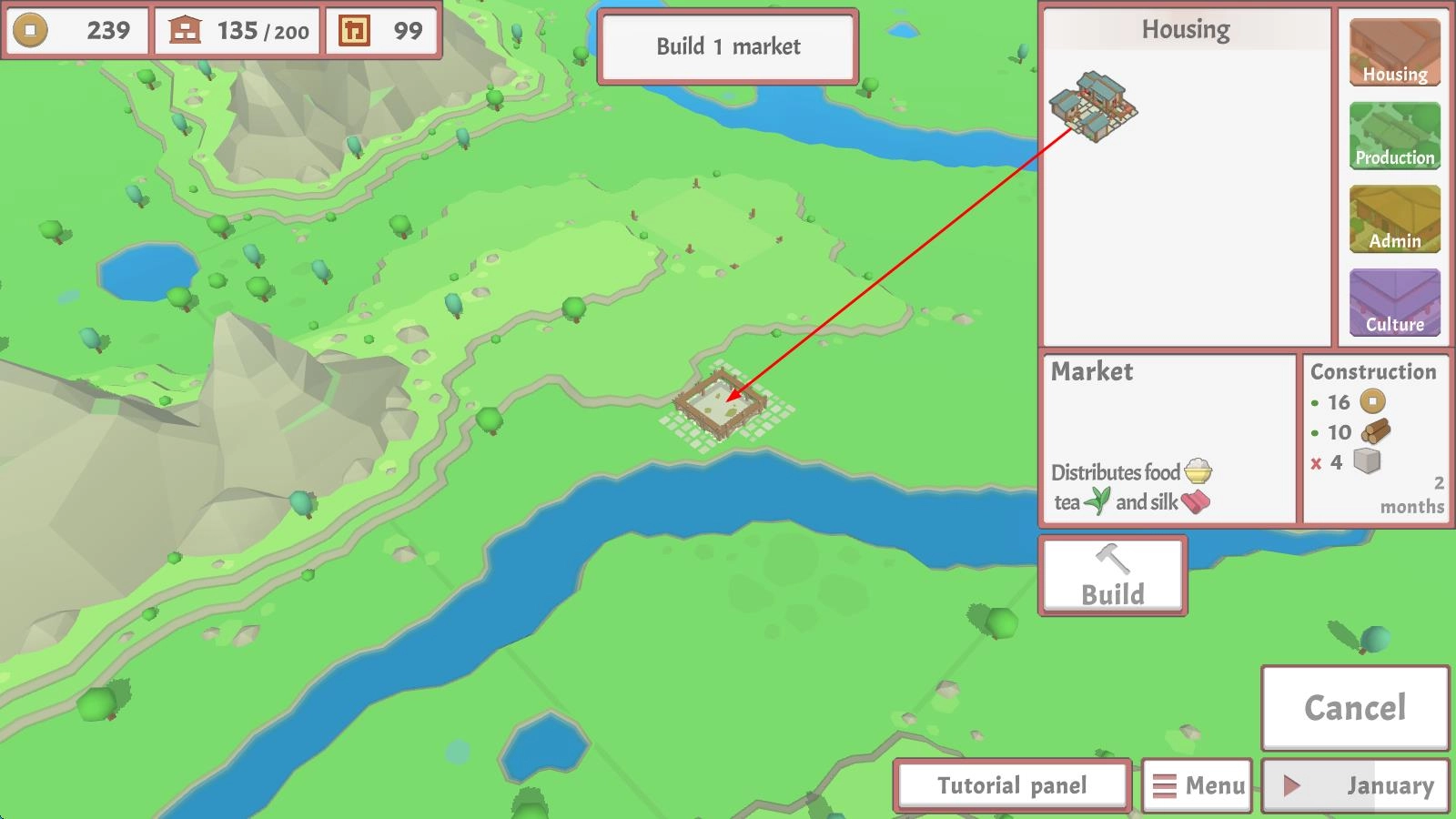 2、进入先挑选地图,点击“建造”按钮,从房屋等基础建筑入手,在规划好的位置放置设施,吸引居民入住。