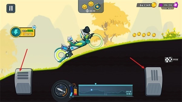 在这款游戏里,右侧的油门踏板是用来让车辆加速的,左侧的刹车踏板能够对车速进行有效控制,只有灵活地运用这两个踏板,才能顺利到达终点。