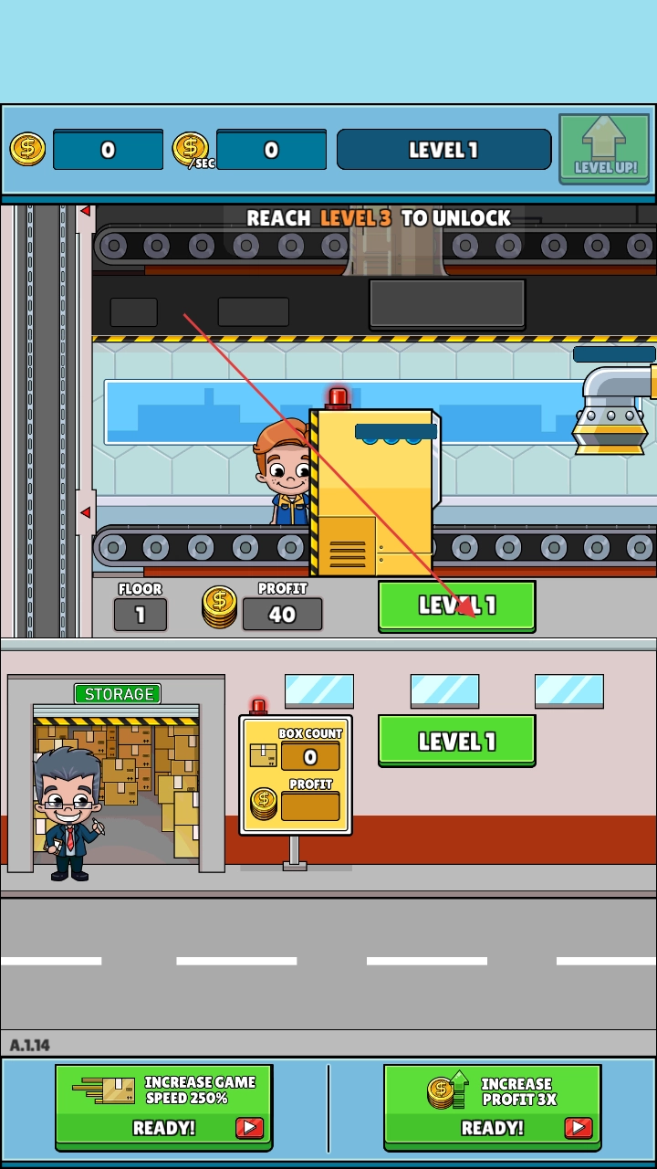 2、进入工厂场景,查看传送带生产流程,点击“LEVEL1”提升楼层生产等级。
