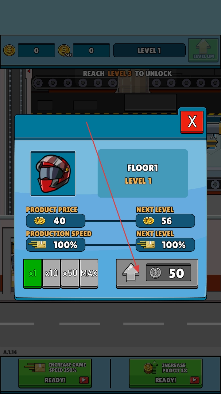 3、在物品升级界面,消耗金币(如50)提升产品价格、生产速度,扩大工厂收益。