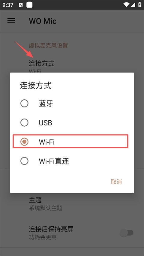 3、在设置界面中,找到并点击“连接方式”,然后选择“Wi-Fi”作为数据传输通道;