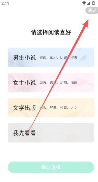 1、进入软件后,点击选择你的阅读喜好,若阅读范围较广,建议直接跳过这部分。
