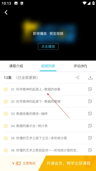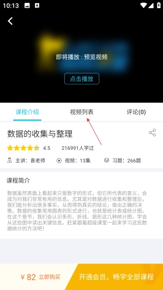 3、在课程详情页,点击【视频列表】,查看该课程包含的视频章节。