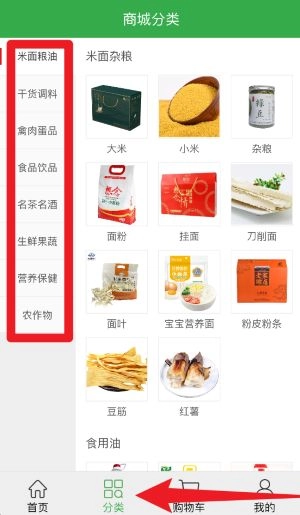 3、点击底部“分类”可进入商品详细分类页面,快速查找米面粮油、生鲜果蔬等乡村特色商品。