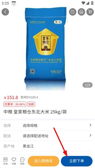 3、在商品详情页面,点击立即下单按钮,进入规格选择页面。
