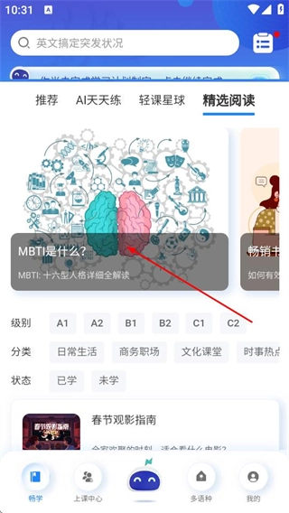 1、在畅学页面的顶部导航栏中,点击“精选阅读”标签,即可进入精选阅读页面。