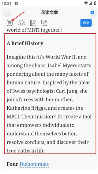 3、在阅读文章页面即可阅读文章,点击左上角的按钮翻译也可查看中文进行阅读。
