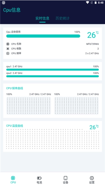 CPU设备信息是一款专业的硬件检测工具,能为用户呈现详尽的设备参数信息,方便用户在线直观查看,全面掌握CPU的整体运行状况,涵盖温度、核数、频率等关键数据,实时监测设备的运行状态。软件内设有多种功能的检测服务,会自动记录每次检测的历史记录,检测报告清晰明了、易于查阅。此外,通过这款软件还能对手机进行优化操作,有相关需求的用户不妨前来体验一番。