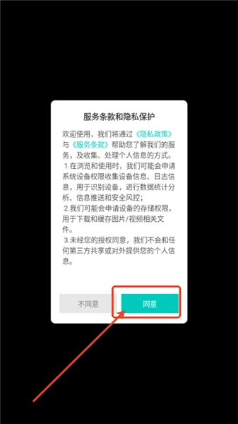 1、首次启动应用,请在服务条款弹窗点击同意进入主界面。