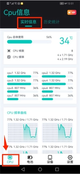 2、在主界面中找到并点击CPU选项,查看实时使用率以及各核心的相关数据。