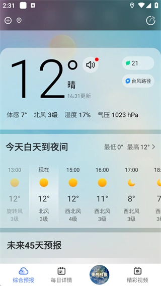 1、综合预报:依托定位功能实时呈现天气态势,提供体感温度、风向风力等详尽数据,帮助用户全方位把握天气变化情况。