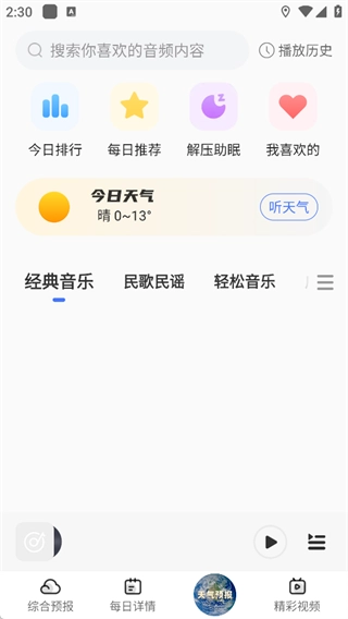 3、天气预报:整合天气播报与音频内容,用户可听天气,还能浏览音频分类,获取天气时享受音频服务。
