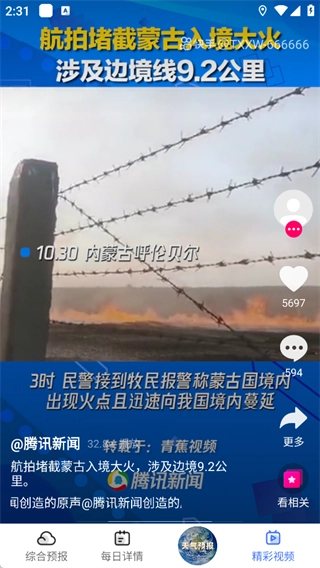 4、精彩视频:推送热点新闻视频,用户可观看,拓展资讯服务,让用户了解天气同时知晓时事热点。