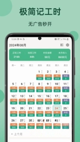1、薪资管理,允许用户自行设置每小时工资和加班工资标准,设计十分人性化。