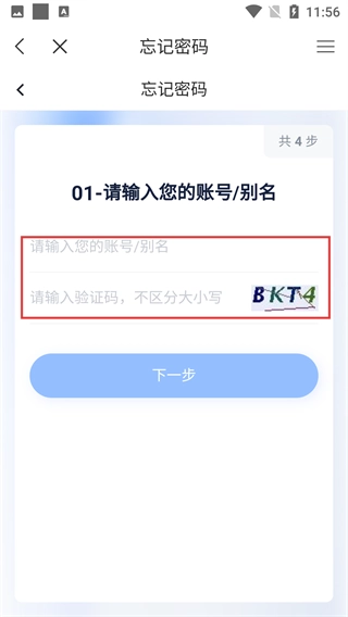 4、在忘记密码页面输入【账号/别名】和验证码,点击【下一步】,继续密码找回流程。