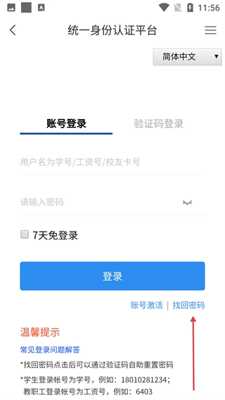 3、在统一身份认证平台点击【找回密码】,进入忘记密码页面。