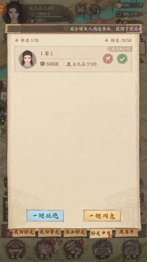 章节解锁:首个故事章节默认开启,后续章节在完成前置章节且官职等级达到要求后解锁,完成章节可获取大量招贤通宝奖励,解锁除暴安良高等级头目。