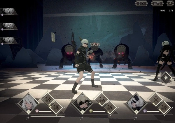 尼尔康乃馨采半自动式,角色会自动用普攻攻击敌方,在手动模式下玩家可以点选目标、角色技能(点选角色头像即可施放)、武器技能、同伴技能;自动模式角色会自己施放武器技能,目标、角色技能和同伴技能则需玩家自己点选。