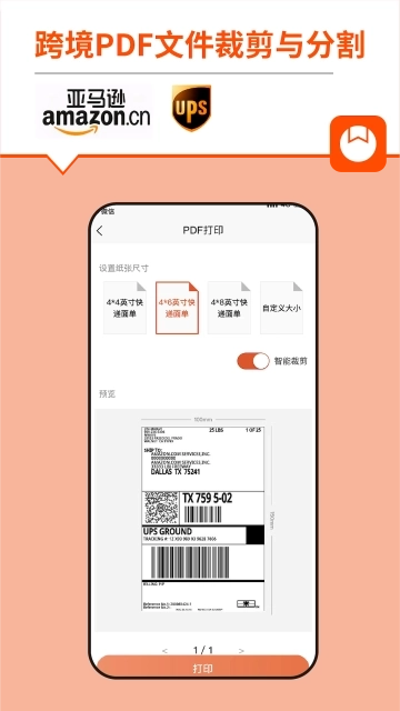 针对亚马逊、UPS等跨境行业PDF文件,支持智能裁剪空白,设置自定义尺寸并进行在线打印。