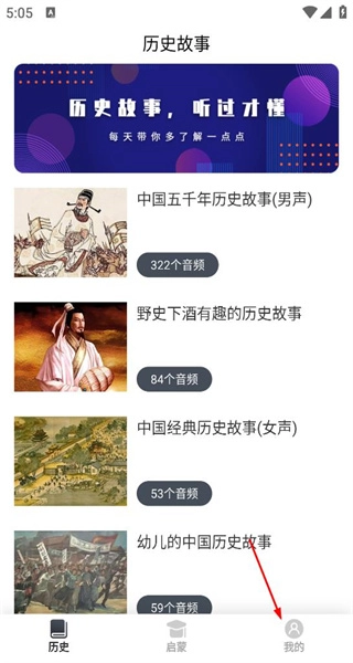 打开软件主界面后,会呈现出多个历史故事音频的分类板块,每个分类旁边都清晰标注了对应的音频数量,界面底部则设置了“历史启蒙”“我的”等功能选项。