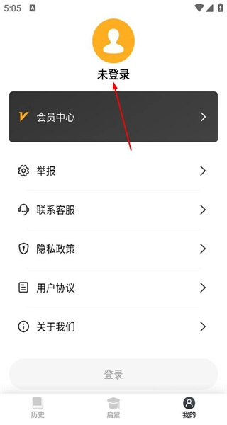 2、点击我的进入个人页面,页面显示未登录状态,设有会员中心举报联系客服等功能,上方有对应的状态标识。