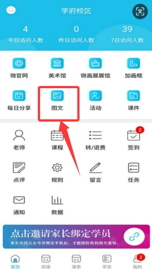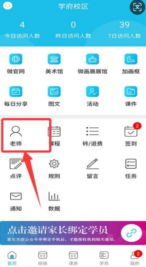 1、家长登录系统进入主页后,点击课程表板块或通知栏区域,即可查看教师发布的最新课程安排信息以及校园动态内容。