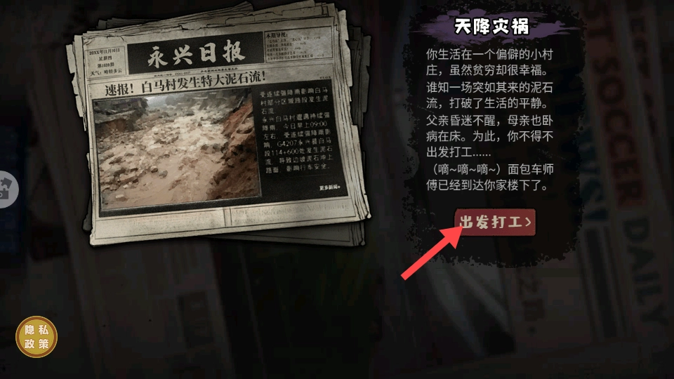 3、阅读剧情介绍,了解背景后点击【出发打工】,正式进入剧情体验。