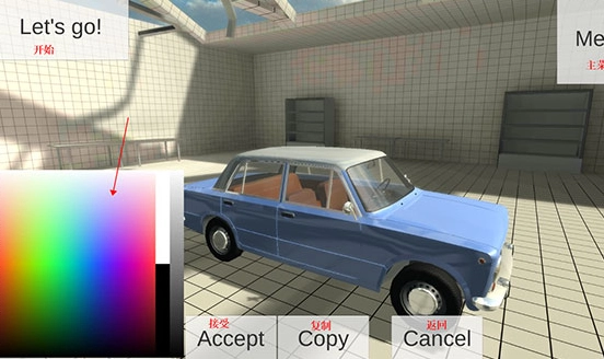 进入车祸物理模拟器游戏后,你可以通过点击界面左右两侧的箭头来切换并挑选心仪的车辆;同时,也能借助左下角的【Color1】和【Color2】选项,分别对车身与车顶的颜色进行自定义设置。