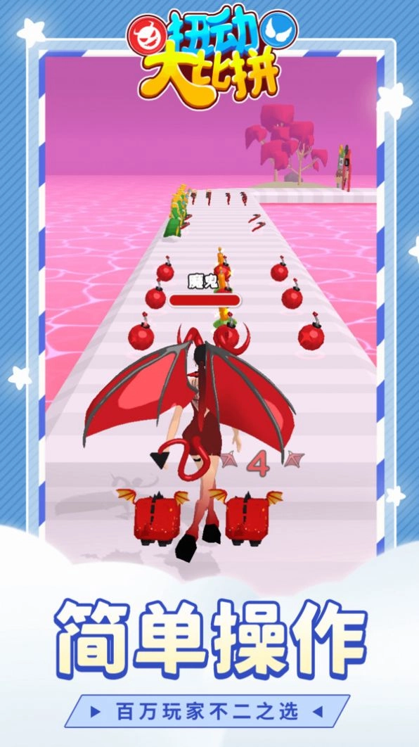 在《扭动大比拼》里,玩家能体验到趣味十足的休闲冒险闯关玩法。你可以根据自身喜好挑选角色与关卡开启冒险,凭借技术和经验助力自己顺利游玩,尽情享受游戏带来的刺激与欢乐。感兴趣的玩家,快来加入游戏吧!