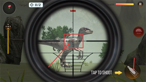 3、瞄准界面中,关注【Target】0/2的目标进度,对准恐龙区域按【TAP-TO-SHOOT】射击,同时留意自身【HEALTH】状态。